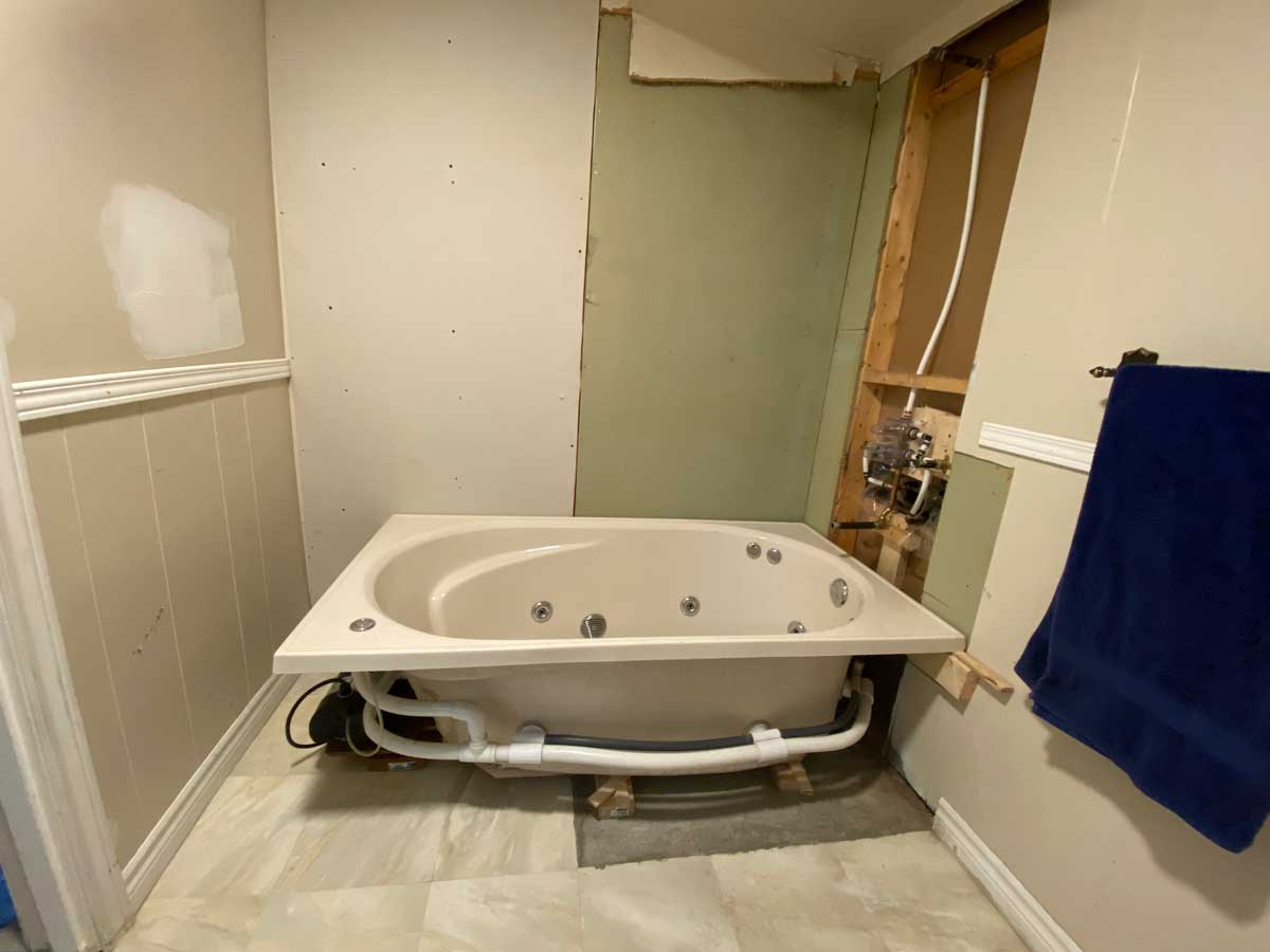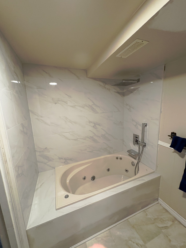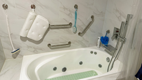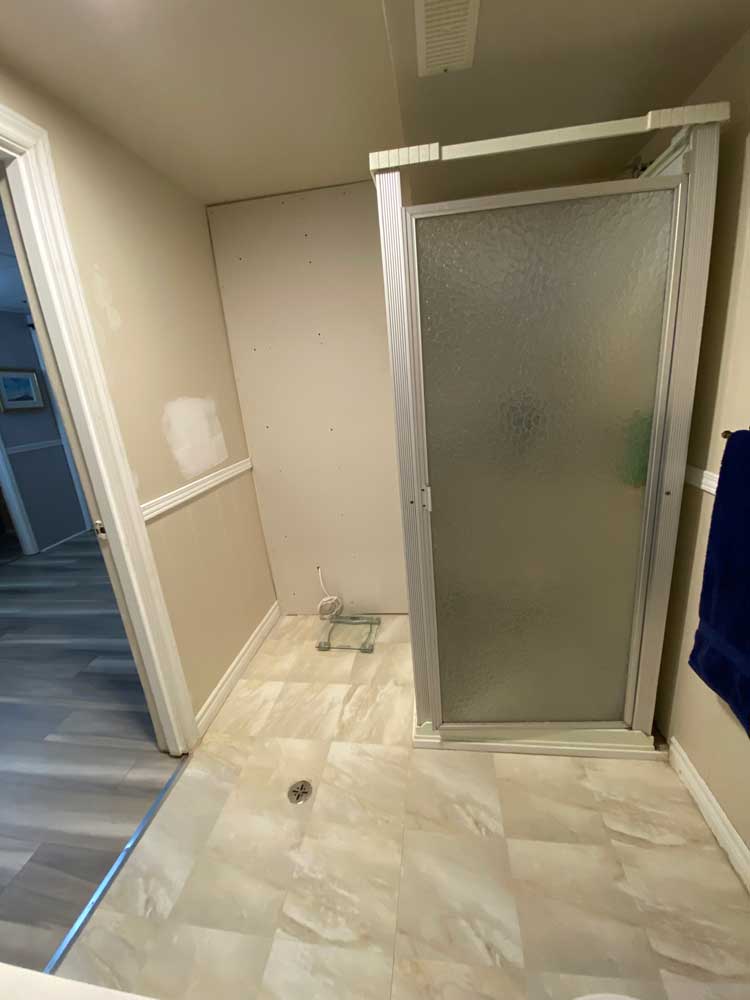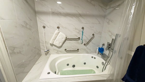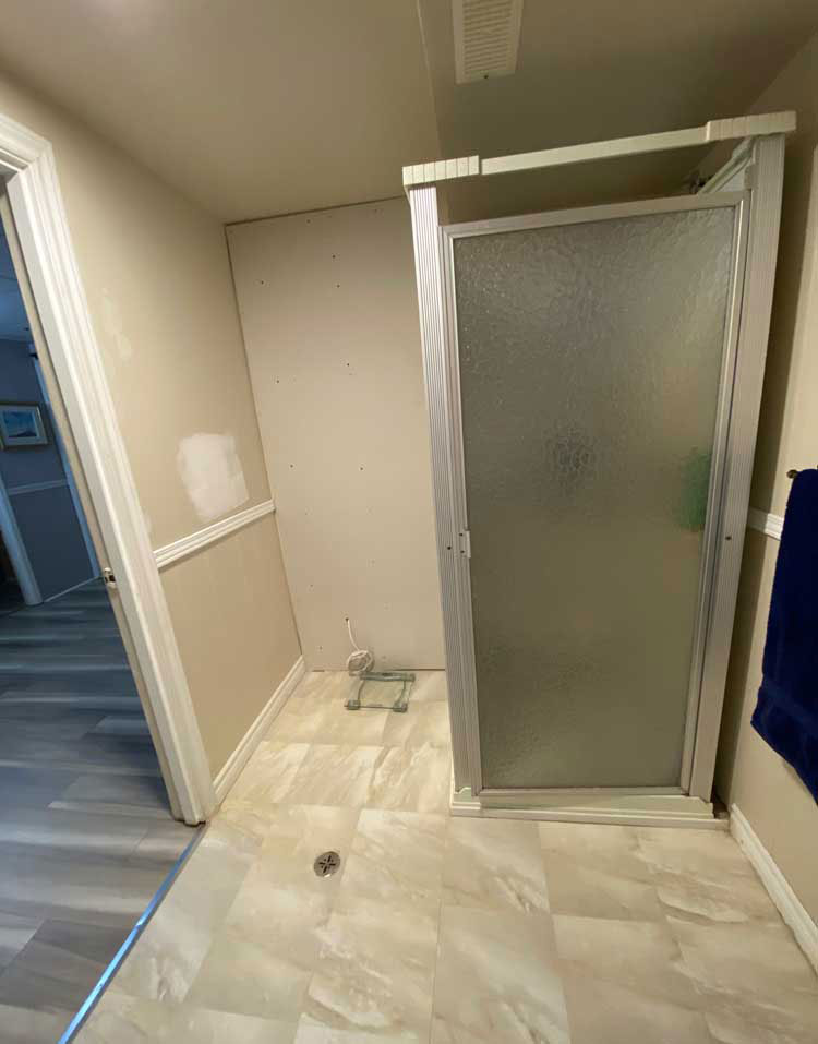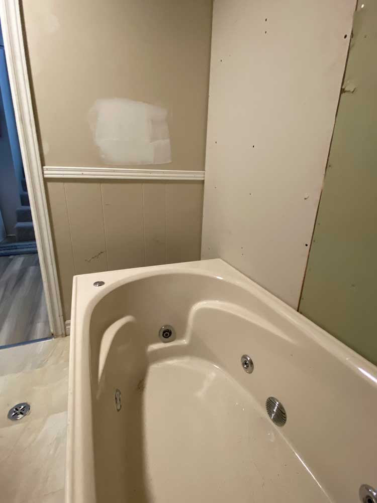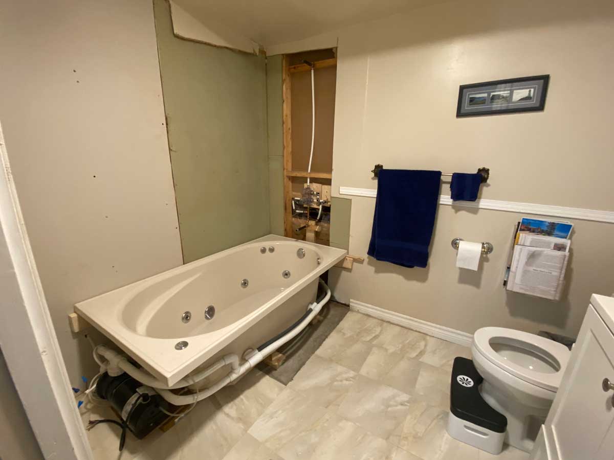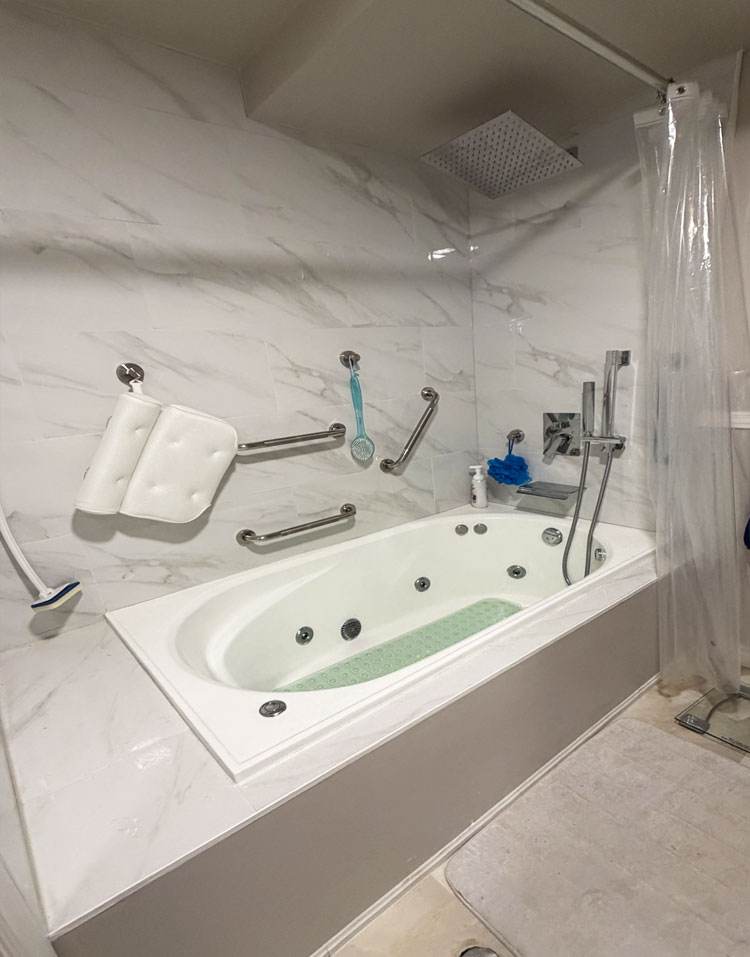Transition from Shower Stall to Jacuzzi Tub 2025 Door was moved to the other wall when flooring was replaced 4 grab rails installed 6″ tiles – all plain – no pattern This is the shower and tub hardware that I purchased from Amazon Old Shower Stall before removal